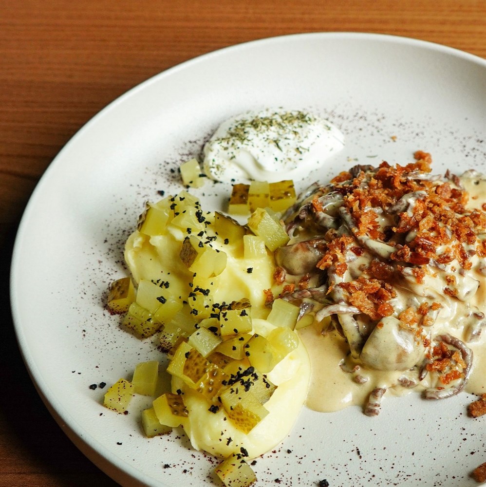Бефстроганов с грибами и картофелем